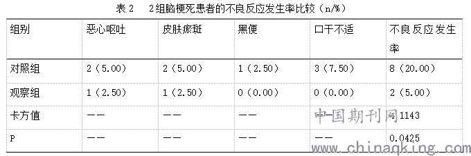 观察对比2组脑梗死患者临床疗效、不良反应发生率、治疗前后神经功能缺损评分(NIHSS)。NIHSS评分标准:0~42分,随着分值增加患者神经功能缺损程度不断升高。