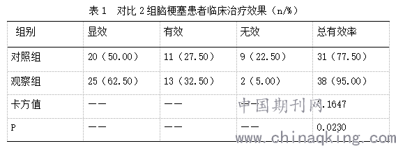 2.1 两组脑梗塞患者临床疗效对比 观察组脑梗塞患者的总有效率高于对照组,组间数据对比:P<0.05(见表1)。