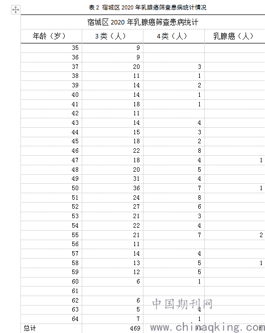 近年来,随着宿迁市进一步加强对两癌筛查知识推广和普及,有助于顺利对宿迁市妇女进行癌症筛查。乳腺癌是临床上常见女性恶性肿瘤,极易对女性产生生命威胁。我国女性乳腺癌患病因素较多,常见因素为患者生活方式和不良饮食习惯。当前,乳腺癌患者确诊后部分已发展为晚期,患者治疗困难并且死亡率高。这通常与患者所在地区和教育水平、健康意识密切相关。在宿迁市积极进行癌症筛查,可促进女性早期发现乳腺疾病,并进行积极治疗与干预,显著减轻女性乳腺癌疾病发病率并提高了早诊率,加强女性生理健康。作为临床参考,本文作者分析了2020年宿迁市宿城区部分农村妇女乳腺癌筛查结果[1]。