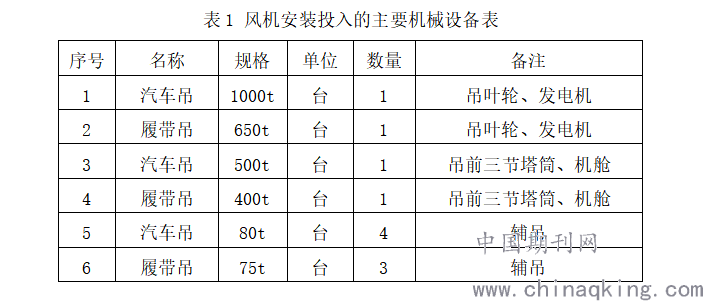 提前在风机吊装场地进行主吊机械组装;对机械进行试验确认性能可靠后进行风机吊装。吊装的主要机械设备见表1。