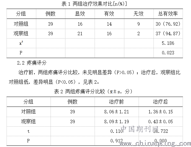 ①统计临床治疗效果,疗效判定:局部探痛、叩痛等临床症状全部消失或者改善明显,咀嚼功能正常,表示显效;以上临床症状,基本缓解,咀嚼功能接近正常,表示有效;与以上判定指标不符,表示无效。()*100%=治疗总有效率。②评估疼痛程度,依据视觉模拟评分法(VAS),分值越高,表示疼痛越严重。