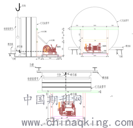 装置由设备托架、牵引设备、横挡板三部分组成,设备托架主要是固定设备,确保在使用中设备不移动。牵引设备主要是提供牵引的动力。挡板主要是利用钢丝绳传递力至挡板推进管节移动,实现管节拼装。在已安装管节一端放置好牵引设备,利用牵引设备的钢丝绳拉动挡板带动管节整体移动,完成管节拼装。