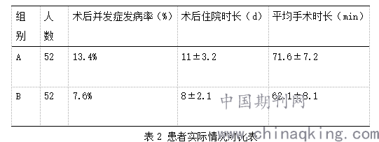 A、B两组的患者人数均为52人次,其中A组出现术后并发症的人数为7人,其发病率为13.4%,B组出现术后并发症的人数为4人,其发病率为7.6%。A组的平均住院时长为11±3.2d,B组患者的平均住院时长为8±2.1d。在手术持续时间方面A组患者手术平均时长为71.6±7.2min,B组患者手术平均时长为62.1±8.1min,具体统计结果详情见下表2。