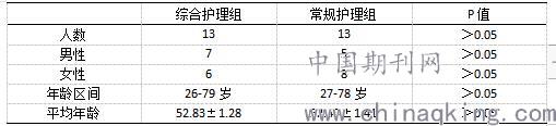 2020年7月-2020年9月,病例数:26例,患者类型:接受无菌手术的骨科患者。随机分组:综合护理组和常规护理组,两组实验样本的情况如表1所示: