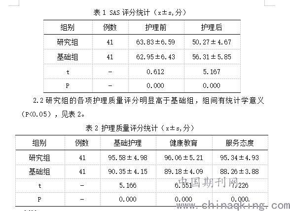 使用SAS评分量表评估两组患者护理前后的焦虑程度,标准分界值为 50 分,50 ~ 59 分为轻度焦虑,60 ~ 69 分为中度焦虑, 69 分以上为重度焦虑。统计两组的护理质量评分,包括基础护理、健康教育、服务态度三项内容,分数越高,表明护理质量越高。