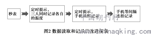 改进探索 2:数据读取和记录的研究、改进过程. 如图 2 所示,笔者尝试了秒表、定时提示人工记录、定时提示手机拍照记录和手机自动等间隔连拍等手段.