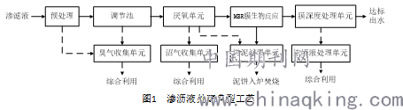 经过对国内垃圾焚烧发电厂垃圾渗沥液系统的调查,总结出渗沥液处理典型工艺流程设计如图1。
