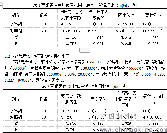 两组患者病灶累及范围与病变位置在上叶尖、后段或下叶背段的比例差异无统计学意义(P>0.05);而病变累及肺下叶前内基底段比例(65.00%)、两叶以上比例(75.00%)、双肺受累比例(85.00%)均明显高于对照组(30.00%、40.00%、55.00%),差异具有统计学意义(X2=4.912、5.013、4.286,P<0.05),具体情况见表1。