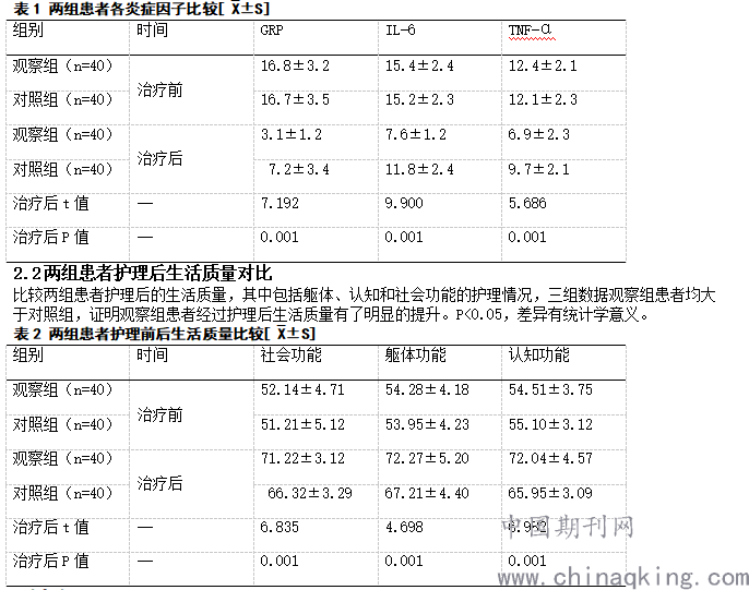 炎性因子主要包括GRP、IL-6、TNF-α参数比较,两组患者护理前后炎症因子检测相差较大。并且三组数据观察组患者全部低于对照组,P<0.05,差异有统计学意义。