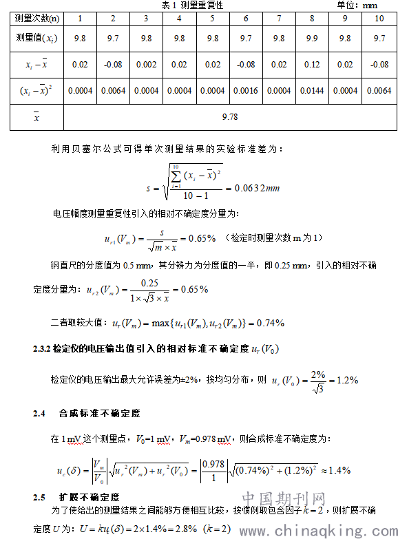 按照检定规程要求,记录方波幅度,在重复性条件下进行10次测量,测量结果见表1。
