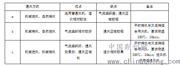 由于隧道不具备自然排烟条件,本设计在考虑通风设计的同时还要考虑其排烟功能。机械通风有三种方式,即:①机械进风、自然排风;②机械排风、自然进风;③机械进风、机械排风。以下为三种机械通风方式的优缺点比较:
