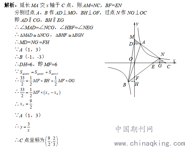 (2)若BN与y轴交于点F,根据铅垂高、水平宽可以表示出而本题出现多条直线与反比例函数相交,再考虑利用等线段性质,将MD转移到线段FH,从而求出MF=DH=6,这样就减少了很多的计算量,可以提高做题速度。