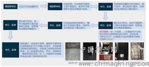 第一,根据公司多个项目的交付使用客户反馈,维修率最高的是漏水问题,针对这一情况,精装修阶段应进行精细化管控,例如补充防水工程停止点检查,淋浴房蓄水24小时后,通过施工单位、甲方、监理三方的自检和复检,满足要求后进入下一阶段,从而提高施工质量,流程如下。