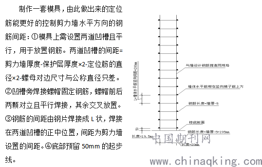 而对于竖向的钢筋间距控制措施主要包含有:采用在铝合金角钢上刻槽,间距为设计要求,性状如马牙槎,用来控制每一根墙体钢筋的竖向间距。