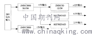 机上28V电源通过DC/DC转换器提供两个5V电源,±12V电源,2.5V参考电源和4.5V参考电源。一个5V电源为主控制器、EEPROM和其他设备供电;一个5V电源单独为串行通信电路供电隔离通信电源,减少干扰;12V为加热控制电路和集成运放芯片提供电力支持;4.5V基准电源提供基准电压给主控制器中的A/D转换模块;2.5基准电源提供2.5V基准电压给充放电电流检测环节。电源电路结构如图1所示。