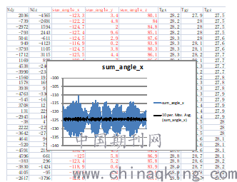 图2为在exceL中绘图的结果,观察其平均值是否满足要求,振荡幅度是否过大(外场主要是由于桌面通电过于简陋,无法确保隔离外界角运动,同时,设备接地无法保证,可能会带来一些干扰,但一般陀螺输出噪声脉冲变化不超过20个)。
