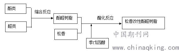 先以丁基酚、辛基酚、多聚甲醛合成酚醛树脂,同时以优质脂松香与季戊四醇进行酯化反应,得到松香季戊四醇酯,最后,在一定条件下,让松香季戊四醇酯与酚醛树脂反应而得到的一类松香改性酚醛树脂,树脂再经过水洗、精馏、真空等先进的生产工艺处理,得到高档环保油墨树脂。该树脂具有高分子量、高粘度、高弹性、高溶解性、高光泽的特点,广泛应用于高速印刷四色亮光油墨,金、银、铝箔等合成纸张印刷油墨及高档环保大豆油油墨。