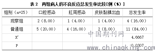观察组在口腔感染、肛周感染、皮肤黏膜出血分别是8.00%(2例)、4.00%(1例)、4.00%(1例),优于普通组,组间差异显著,P<0.05。