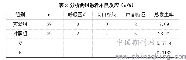 实验组应用改良小切口手术,患者经全身麻醉后呈平卧体位,对肩部进行垫高处理。经常规性消毒与铺巾以后,在患侧横行做出切口,长度一般在2.5-4厘米之间。将患者甲状腺暴露后游离处理,对神经加以保护并完成肿物分离操作,将腺瘤剥出以后对蒂部进行切断处理,随后结扎并切除腺瘤[3]。