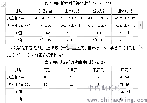 2.1观察组在社会功能、物质状态、躯体功能和心理功能四大项目护理质量评分的比较中,观察组明显高于另一组,差异符合统计学意义的评判标准(P<0.05)。详细数据请见表1.