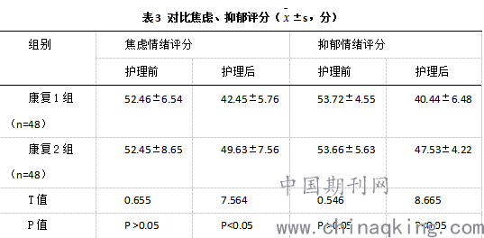 护理前,康复1组与康复2组比较,焦虑、抑郁评分差距偏小,差异无统计学意义(P>0.05);护理后,康复1组与康复2组比较,焦虑、抑郁评分差距明显,前者偏低,差异有统计学意义(P<0.05)。详见下表: