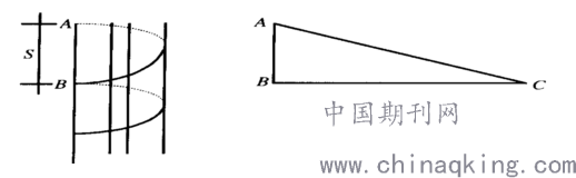 如图1 所示,螺旋箍筋从A 点起,绕圆柱形构件一周后到达B 点,则A 、B 间的距离称为螺距(S);设圆柱形构件的设计直径为R ,半径为r ,则考虑混凝土的保护层厚度C (一般取25mm)和箍筋直径d后,螺旋箍筋的螺旋半(r-C+d/2)(m) 。我们所要求取的即为螺旋箍筋以螺旋半径(r-C+d/2) 绕行一周后的长度,由几何知识可知,将B 点处圆柱形构件展开,实际箍筋长度就是图1中的A 、C间的长度,而B 、C的长度就是以螺旋半径(r-C+d/2)为半径的圆的周长,故根据几何知识,可以得到(2)的计算公式: