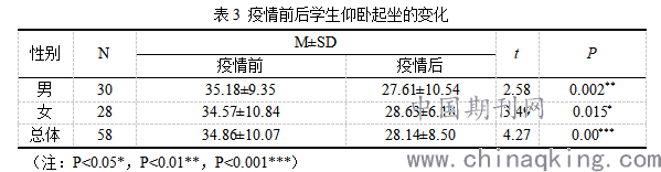 由表3可知,男生疫情前后仰卧起坐成绩分别为35.18、27.61个(t=2.58,P=0.002<0.01);女生疫情前后仰卧起坐成绩分别为34.57、28.63个(t=3.49,P=0.015<0.05),根据统计可知疫情前后男生、女生力量素质都具有显著性差异。