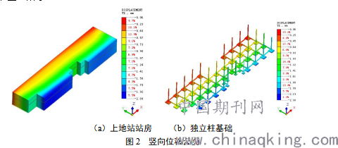 上地站站房及其独立柱基础西侧沉降值较大,沉降值分别为-2.09mm及-2.38mm,东侧沉降值均小于0.5mm,且变化较明显,相邻独立柱最大差异沉降为1.03mm,既有结构影响主要为西侧两跨范围。