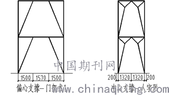 根据实际距离,具体布置如图4示意。2.8m跨采用稍微变形后的人字形-中心支撑,这样可以使通行净宽变宽,在2m高的范围里净宽达到约1.75m左右。4.57m跨采用门架式1-偏心支撑,消能梁段加劲肋加密,满足构造要求。