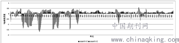 2020年部分成区段为负值,与“2020年5-7月集中精调”相吻合;在正值的单元中,2020年小于2018年的单元占大多数,说明2018年夏季高低发展较快(图2)。
