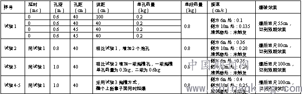 (1)菱形中孔掏槽方式可靠可控,爆破进尺1m,单孔装药量0.6kg,掏槽数量16个,辅助眼45个,周边眼30个,底板眼8个,单段最大装药量0.6kg,一次起爆药量39.8kg,掏槽单孔起爆,实施控制稳定,爆破振速控制效果较好。但孔多装药量大,作业时间长,经济性较差。建议在距建筑物最近处,采取菱形中孔掏槽、逐孔起爆方案,可有效控制爆破振速在0.4cm/s之内。