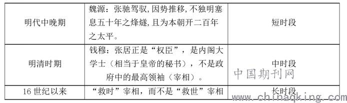 历史学科本身是一门注重时序的学科,要在特定的时间和空间背景下,对历史事件、历史人物进行分析。在日常的历史教学中,教师要多引入地图、示意图、时间轴、大事年表等来帮助学生构建时空观念。在讲授统编版七年级下册张居正改革这一目时,如何分析张居正改革的历史影响?基于时空观念素养培养的要求,教师在这一课中引入了短时段、中时段段和长时段概念(见图1),短时段指的是明朝中晚期,中时段指的是明清时期,长时段指的是16世纪,通过对不同时间段中不同人物对张居正改革的评价,引出学生们思考问题,要从不同的角度来看待同一历史事物,也就是说要培养学生从多个角度来了解历史和认识历史。