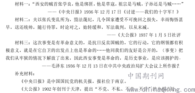 在实际的历史教学过程之中,教师呈现足够的信息,引导学生以多种形式、多种角度来思考问题,切记以偏概全。例如,在讲授统编版八年级上册《西安事变》一目时,如何评价西安事变教师引用了三则史料,并进而提出问题:这三则史料对于西安事变的评价是怎样的?为什么三者的评价会有如此差异呢?西安事变在中国近代史上具有重要影响,其和平解决成为时局转换的关键,为第二次国共合作的实现创造力前提。通过阅读史料,学生们就会发现,教材中对于西安事变的评价都是正面的,但是在展示的史料中却出现了“贼首”“绑匪”“草寇”等带有污辱性的词语,说明张学良和杨虎城的举动在国民党内引起了轩然大波,广大的国民党人认为张杨二人的行为是错误的,是大逆不道的,而共产党人对西安事变的看法则是赞同支持的,因为广大的共产党人,希望蒋介石抛弃“攘外必先安内”的方针,一致对外,《大公报》持中立的立场,客观的评价了此次事件。(史料见图2)通过多角度阅读和分析史料,培养学生从不同的角度来看待历史,学会客观的、理性的、全面的分析历史世界。
