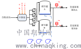 1)混凝池三氯化铁自动投加程序:根据烧杯实验得知最佳药剂投加量,然后在DCS中设定投加量,可变频的药剂投加泵将根据曝气调节罐出水流量计的瞬时流量自动调节频率。