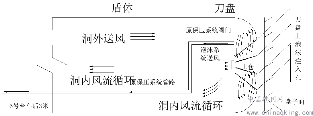 开仓前土仓内的空气循环主要利用旋转接头的泡沫系统通过泡沫管路向刀盘前方吹入风,土仓隔板上的原有保压系统的管路为排气通道,排风到盾构机后配套尾部,形成循环,稀释土仓内的气体,气体含量检测达到要求后,方可进行开仓作业。仓内作业过程中,土仓内空气循环主要利用土仓隔板上孔口(原有的土仓隔板上预留的水电入孔)将风吹入,土仓出入口为排气口,形成循环,保证土仓内的空气质量。洞内通风主要利用洞外压入式通风机供风,形成循环,洞内及仓内通风的同时,进行气体检测,保证作业人员作业环境的安全。