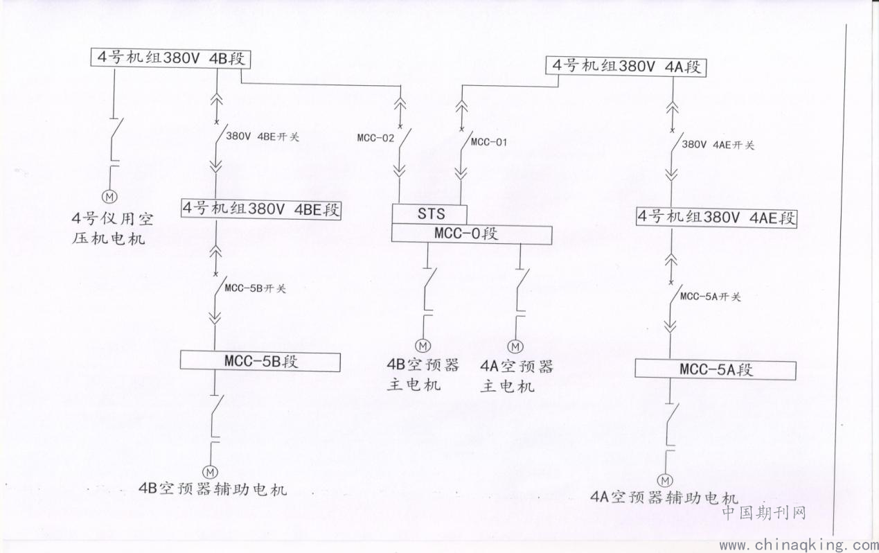 4A空预器辅助电机电源接在4号机组MCC 5A段,4B空预器辅助电机电源接在4号机组MCC 5B段, MCC 5B段电源来自380V 4BE段,380V 4BE段电源来自4号机组380V 4B段3号盘柜。