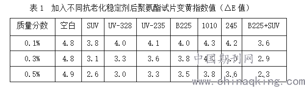 从表1数据可以看出,在不使用任意一种稳定剂的时候,试片的变黄程度最明显;单独应用受阻酚类抗氧化剂以及单独任何一种苯并三唑类的紫外线吸收剂的时候,变黄程度也都比较高;但是同时应用了两种稳定剂的时候,变黄程度最小,且B225氧化剂组合SUV紫外线吸收剂,有着非常好的抗黄效果。通过研究可见,芳香族聚氨酯材料中同时使用紫外线吸收剂、抗氧剂,有效地提升了聚氨酯对于紫外光线的稳定性。