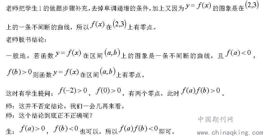 老师根据刚才的讨论概括零点存在定理,学生产生疑问,如果在区间上断开了也会依然有零点,老师强调,在所讨论的区间上不断开即可。