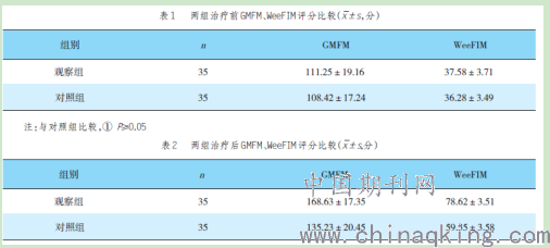 2.1 观察治疗前的GMFM 评分、WeeFIM 评分观察治疗前的GMFM 评分、WeeFIM 评分与对