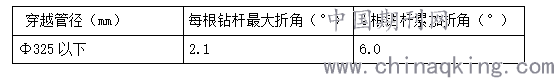 如对于因地质条件复杂可能导致的导向偏离预定轨迹,主要在工勘、设计阶段合理选择轨迹进行提前预防。根据《油气输送管道穿越工程施工规范》GB50424-2015标准,钻杆折角宜符合下表。