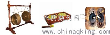 (3)卡斯锣(kesi )(图6-3 ) 是由四个直径为2至4英寸的黄铜圆盘连接在一块大约为12英寸正方形木块上,卡斯锣的演奏方式是用表演者手中持有的另外两张黄铜圆盘敲击固定的黄铜圆盘。这些圆盘要么被短暂地敲击,让其持续响动,要么闷击,以获得一种静音。