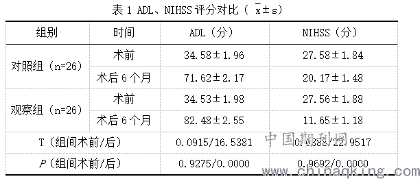 组间ADL、NIHSS评分在术前无明显差异,P>0.05;术后6个月时,观察组ADL评分更高,NIHSS评分更低,P<0.05,见表1。