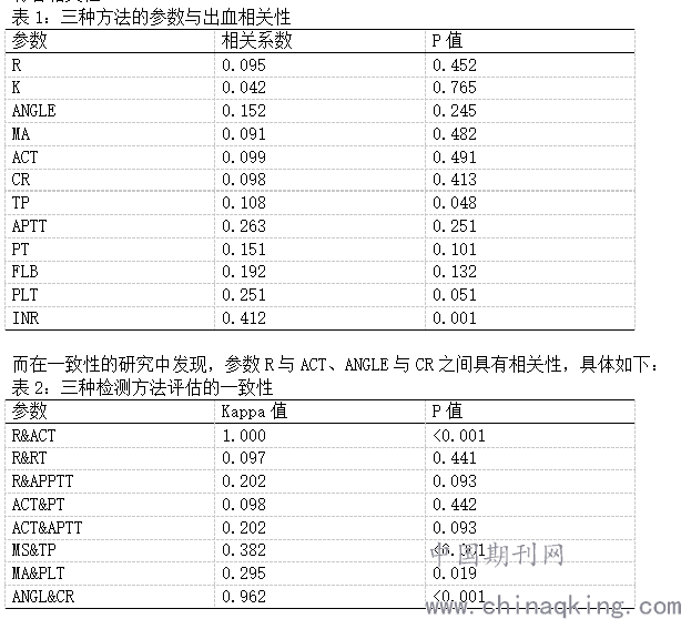 根据研究论证分析,在利用三种检测方法开展检测工作之后,参数R、ACT、PT、APTT、INR等等反映凝血因子的活性有相关性,参数MA、TP、PLT反映血小板的凝血功能有相关性,参数ANGLE、CR、FIB反应纤维蛋白功能呈现相关性,P<0.05。下表反映出参数TP以及INR与出血有着相关性: