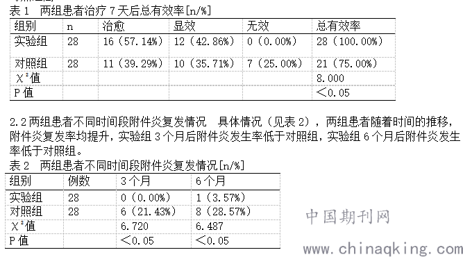我院2018年11月-2021年1月收治的56例附件炎患者按照是否应用抗生素治疗将患者分为对照组与实验组,实验组应用抗生素治疗的28例女性患者年龄区间为:21岁~43岁、平均(28.62±1.52)岁,病程/平均病程为:3天~13天,(8.42±1.42)天。有13例为输卵管炎,有10例为盆腔结缔组织炎,有10例为盆腔腹膜炎,有1例为盆腔结缔组织炎。对照组未应用抗生素治疗而应用康妇炎胶囊治疗的28例女性患者年龄区间为:21岁~41岁、平均(28.61±1.55)岁,病程/平均病程为:3天~12天,(8.42±1.44)天。有14例为输卵管炎,有10例为盆腔结缔组织炎,有9例为盆腔腹膜炎,有1例为盆腔结缔组织炎。两组患者平均年龄、平均病程等基础资料无显著差异(P>0.05)。