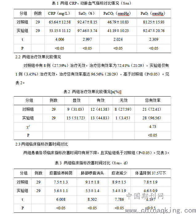 实验组CRP、PaCO2水平低于对照组,SaO2和PaO2水平高于对照组,实验组血气状况有明显改善(P<0.05)。见表1。