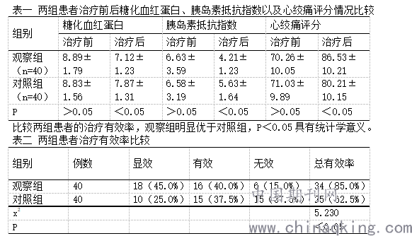 治疗前,比较两组患者糖化血红蛋白、胰岛素抵抗指数以及心绞痛评分情况,不存在明显差异,P>0.05不具有统计学意义。治疗后上述几个方面两组患者都获取一定改善,但观察组的改善情况明显优于对照组,P<0.05具有统计学意义。