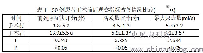 2.2手术前后观察指标改善情况手术后,患者前列腺症状评分(13.9±5.5)分低于手术前的(23.8±5.2)分,生活质量评分(5.9±1.3)分、最大尿流量(7.2±3.5)ml/s,高于手术前的(4.5±1.3)分、(5.4±3.2)ml/s,差异均有统计学意义(P<0.05)。见表1。