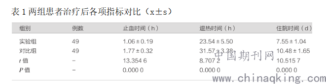分析两组治疗后不良事件发生情况,主要评估内容包括再出血、高温、穿孔,计算不良事件发生率;对两组治疗后各项指标状况进行评估,主要评估内容包括住院时间、止血时间、出血量、退热时间;对比两组患者最终治疗有效率,分为显效(患者接受治疗后呕血现象和黑便现象消失,胃管内引流液透明,血压保持稳定)、有效(患者接受治疗后呕血现象和黑便现象得到缓解,胃管内引流液颜色变浅,血压稳定)、无效(患者接受治疗后呕血现象和黑便现象存在,胃管内引流液浑浊),总有效率=(总例数-无效例数)/总人数×100%。