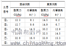 各土层的固结快剪和直剪快剪标准值数据见表2所示。