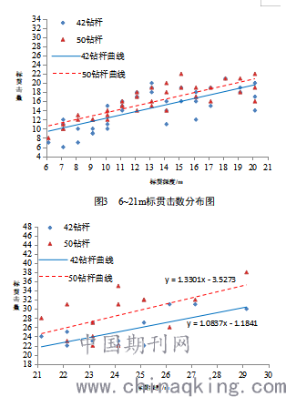 图1~图4分别为标贯击数总体分布图及相同深度区间上的两种直径钻杆所测得N值对比图。根据散点图中深度与标贯击数的相关关系,对0~30 m 内的总体变化规律采用指数函数拟合,对分段深度与标贯击数的关系采用最小二乘法进行曲线拟合。拟合曲线显示所得结果与表3中所得统计结果规律吻合,即在较浅深度范围(0~6m)内Φ42钻杆所测得N值与Φ50钻杆所测得N值相接近,无明显差异,而随着深度(6~30m)的增加,Φ50钻杆所测得N值大于Φ42钻杆所测得N值,且差值具有随深度增加而增大的趋势。根据分段深度与标贯击数的拟合曲线(图2~图4),在0~6m范围(图2)内,Φ50钻杆与Φ42钻杆杆径的差别对标贯击数影响很小,两者标贯击数标准值比值为1.03,可忽略杆径对锤击数N值的影响;在6~21m范围(图3),Φ50钻杆与Φ42钻杆标贯击数N值具有明显比例关系,标贯击数标准值比值为0.91;在21~30m范围(图4),Φ50钻杆标贯击数N值明显大于Φ42钻杆标贯击数N值,且随着深度加深,二者之间的差值逐渐增大。